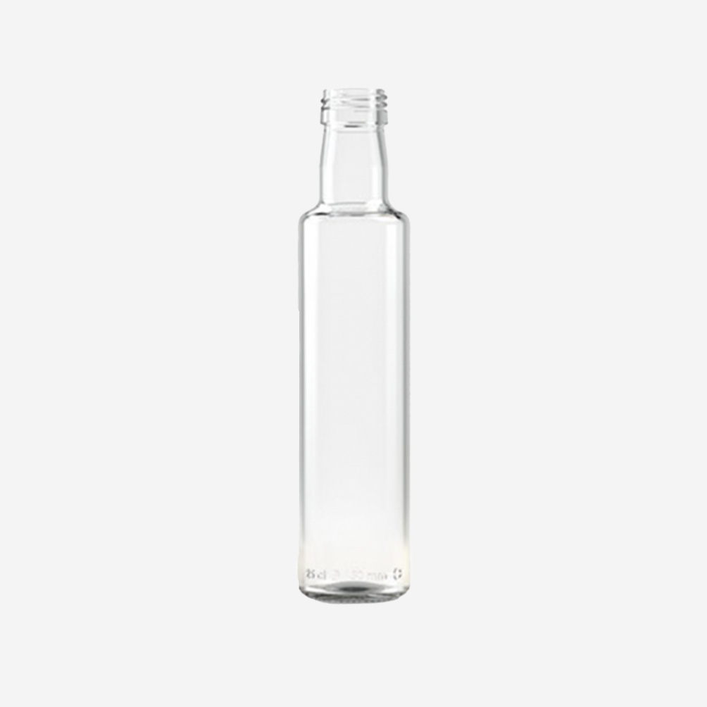 La botella de vidrio Dorica 250, fabricada en vidrio de alta calidad para una máxima resistencia a la manipulación. Con una capacidad de 250 ml, esta botella es perfecta para almacenar y conservar sus líquidos.